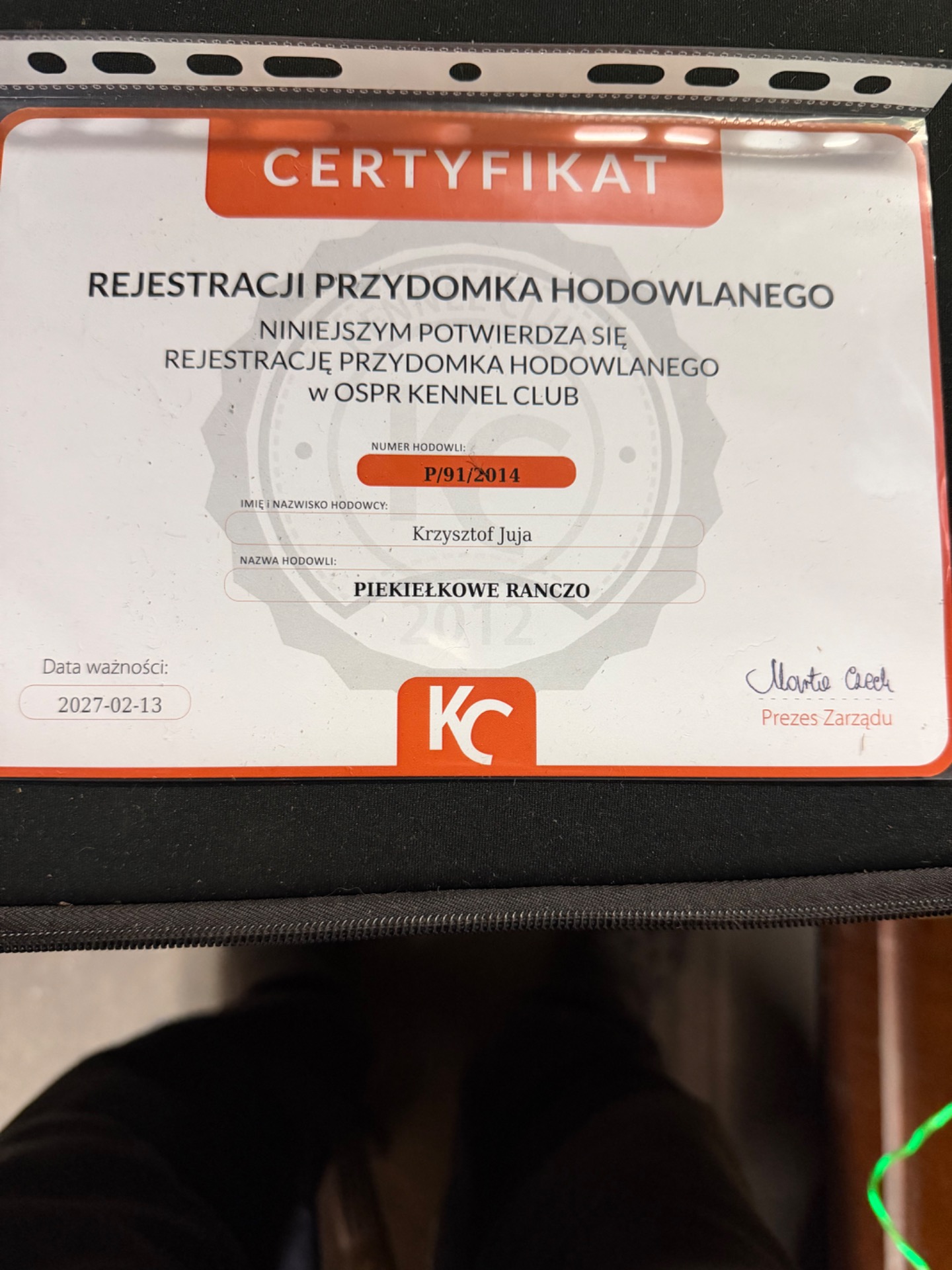 Hodowla zarejestrowana w Ogólnopolskim Stowarzyszeniu Psa Rasowego KENNEL CLUB ul. Plantowa 25, 95-070 Ciężków, Urzędzie Skarbowym i Urzędzie Miasta i Gminy Wolsztyn.